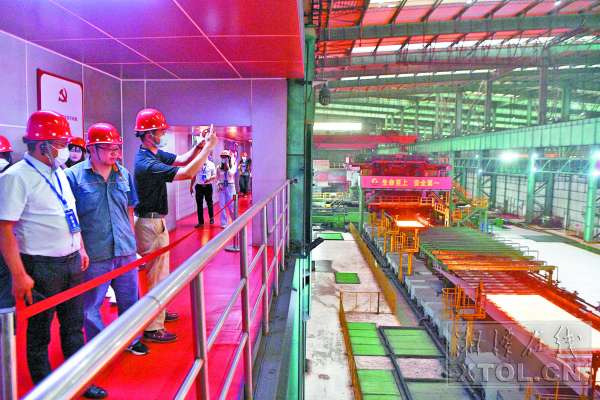 媒体记者和网友代表参观采访湘钢五米宽厚板生产车间。(记者 罗韬 摄)
